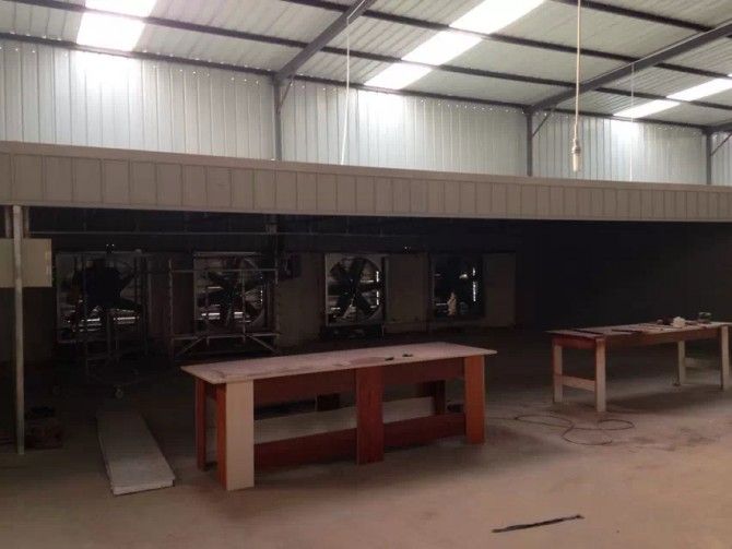 采用负压风机将打磨粉尘抽入集中风道进入喷淋柜,喷淋系统采用水雾降尘原理(使用循环水,噪音小,用水量少)经粉尘喷淋柜,排放室外到100%的粉尘处理效。