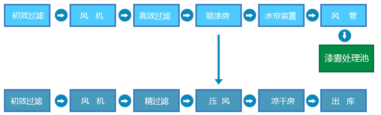 采用正压式压风工作原理,进风采用初效过滤,经过高效过滤进入喷房从而达到无尘喷漆效果。漆雾经过水帘处理到达60%处理效果,进入漆雾处理池从而减少对室外的环境污染。